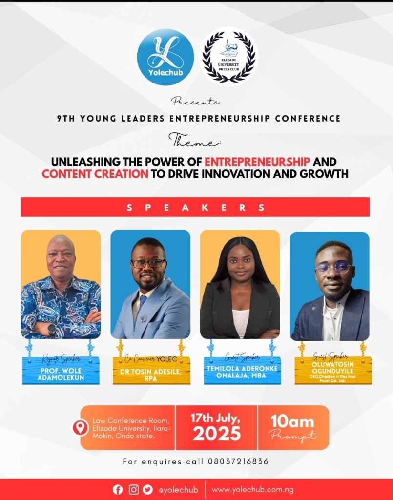 The 9th Young Leaders Entrepreneurship Conference (YOLEC) is set to hold at Faculty of Law Board Room, Elizade University in ilara Mokin on July 16, 2025 by 10 am.