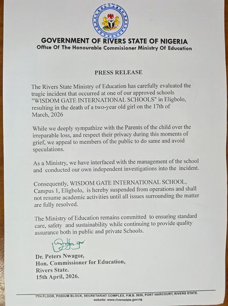 The Rivers State Ministry of Education has ordered the immediate suspension of Wisdom Gate International Schools, Campus 1, Eligbolo operation following the tragic death of a two-year-old pupil on March 17, 2026.