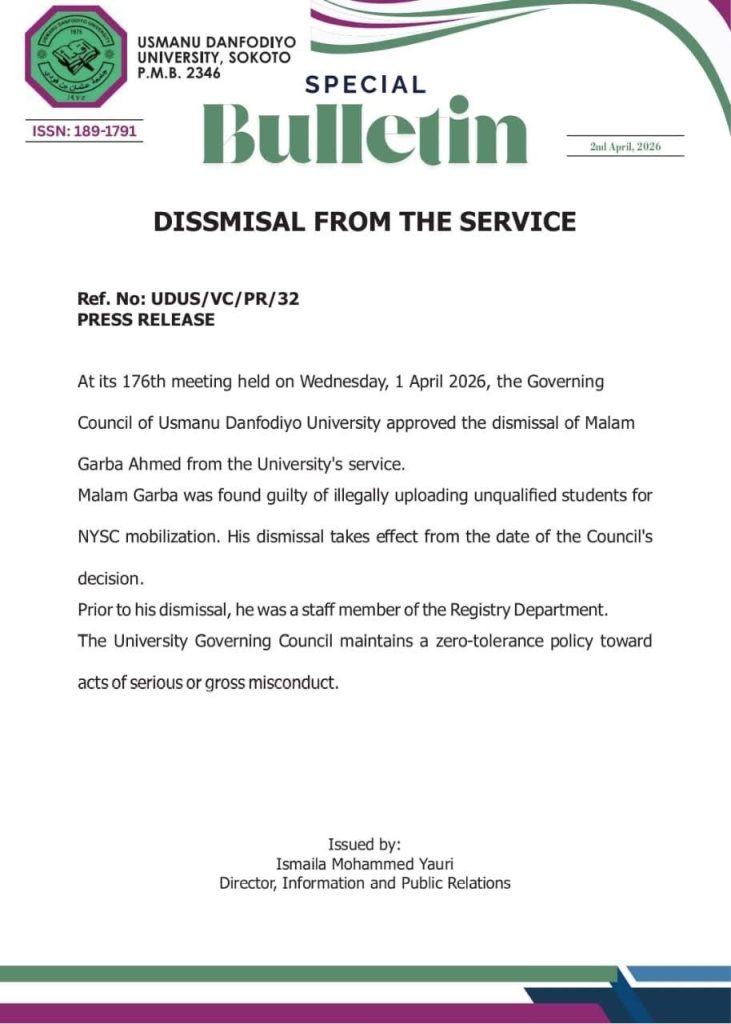 The Usmanu Danfodiyo University Sokoto (UDUS) has dismissed a staff member, Garba Ahmed, over his alleged involvement in the illegal upload of unqualified students for the National Youth Service Corps mobilisation.