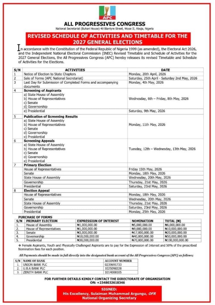 The APC said the revised schedule is part of its preparations for the 2027 elections, aimed at ensuring a smooth, transparent, and well-coordinated internal electoral process.
