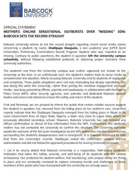 The statement, titled “Mother’s online sensational outbursts over ‘Missing son’: Babcock sets the record straight,” read, “The student’s exit from the University campus was neither approved nor known to the University at the time. In an unfortunate turn, the student’s mother took to social media to sensationalise the situation, falsely accusing Babcock University and its students of negligence and complicity.