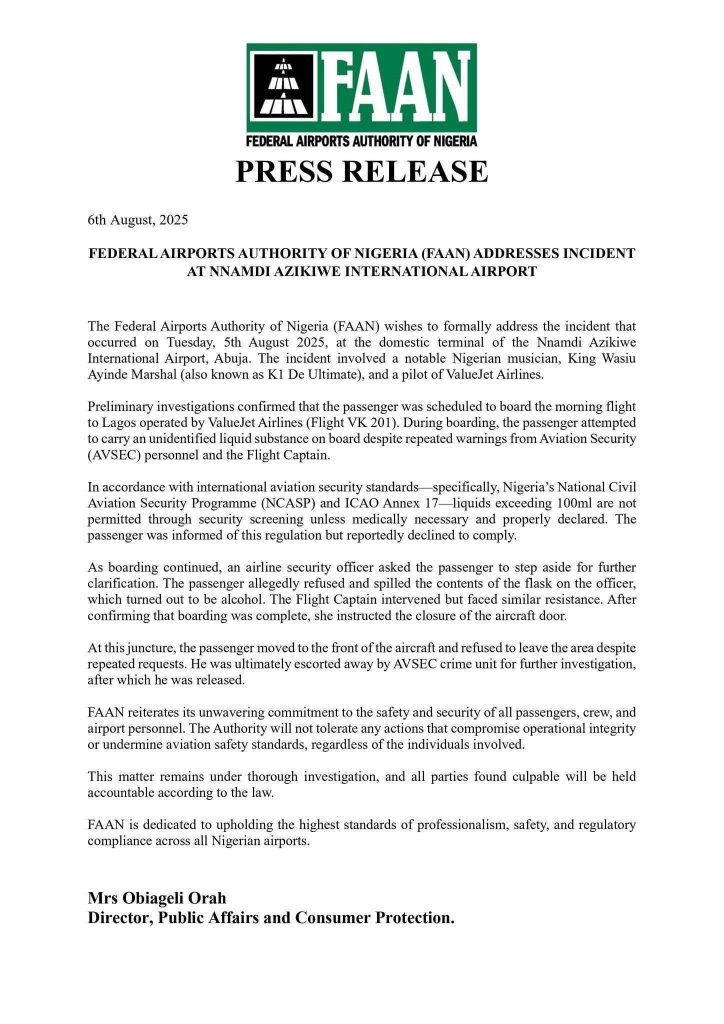 Addressing the issue in the statement on Wednesday, Orah said: “The Federal Airports Authority of Nigeria (FAAN) wishes to formally address the incident that occurred on Monday, 5th August 2025, at the domestic terminal of the Nnamdi Azikiwe International Airport, Abuja. The incident involved a notable Nigerian musician, King Wasiu Ayinde Marshal (also known as K1 De Ultimate), and a pilot of ValueJet Airlines.