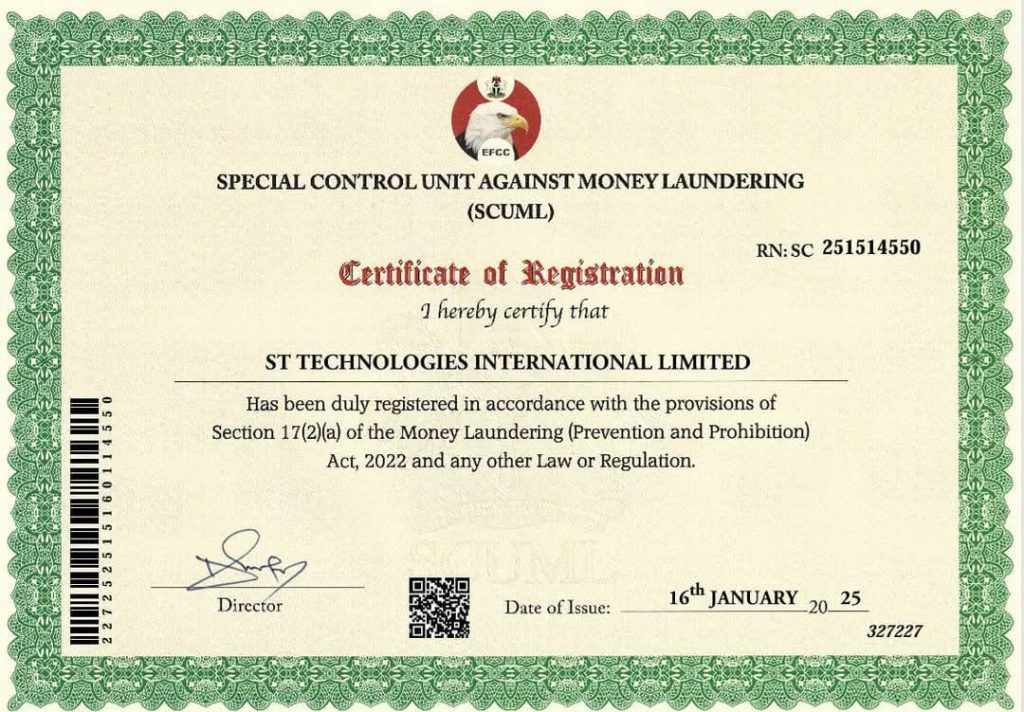 ST Technologies( not CBEX) registered with the Special Control Unit against Money Laundering, SCUML in line with Section 17 of the Money Laundering( Prevention & Prohibition) Act, 2022.