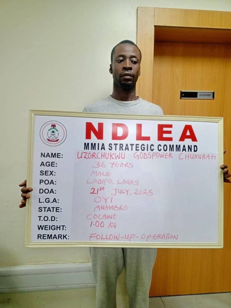 This was disclosed in a statement issued on Sunday by Femi Babafemi, Director of Media & Advocacy, NDLEA he said, “The first batch of the consignment consisting 57,420 pills of tramadol 225mg and 57 pellets of Cocaine weighing 1.60kg were intercepted in a cargo going to Gabon on Air Côte dIvoire on Saturday 19th July 2025. A popular cargo agent Ihekweme Osinachi Benedict handling the shipment was immediately arrested, after which further investigation led to the arrest of another suspect Uzochukwu Godspower Chukwurah on Sunday 20th July.