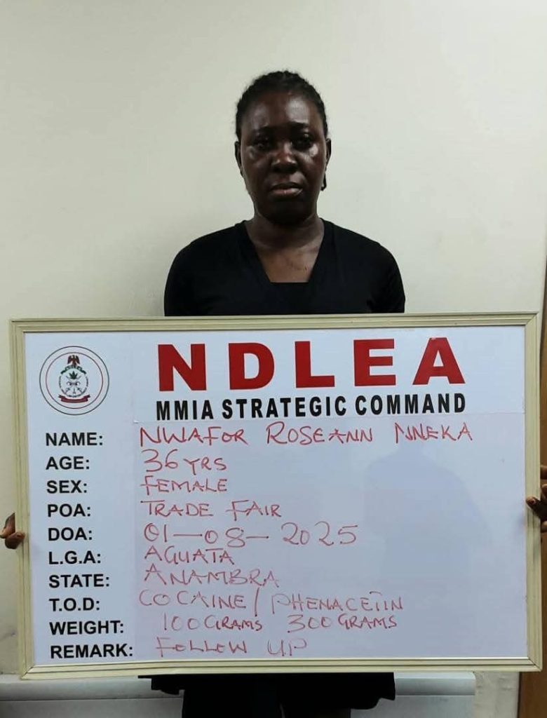 “In a related development, NDLEA operatives on Friday 1st August arrested a businesswoman Mrs. Nwafor Roseann Nneka at her shop within the Trade Fair Complex, Ojo, Lagos following the interception of 100 grams of cocaine and 300 grams of phenacetine, a cutting agent, concealed in ladies lipsticks going to Malabo, Equatorial Guinea, through the export shed of the Lagos airport on 10th July 2025.