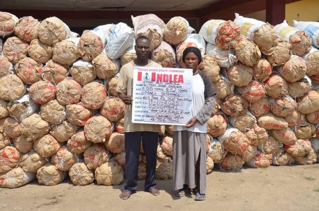 A couple: 55-year-old Onun Okoi Okpotum and his wife 52-year-old Itam Okoi Okpotum were on Wednesday 19th November arrested at their warehouse located at 13 Park road, Ugep Yakur LGA, Cross River state where 362 jumbo bags of skunk weighing 4,706 kilograms were recovered.