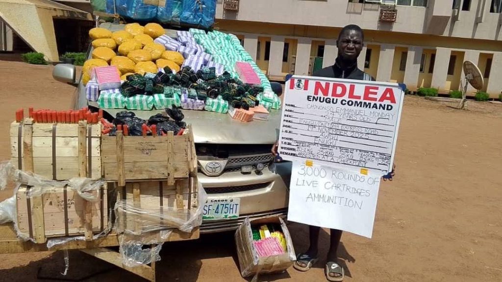 Operatives on patrol along Enugu/Onitsha road, Enugu on Wednesday 19th November intercepted a suspect Chinoso Emmanuel Monday, 24, conveying 10.1kg skunk; 105,600 pills of tramadol 250mg, 225mg and 100mg as well as 700 ampoules of pentazocine injection and 3000 rounds of live ammunition.