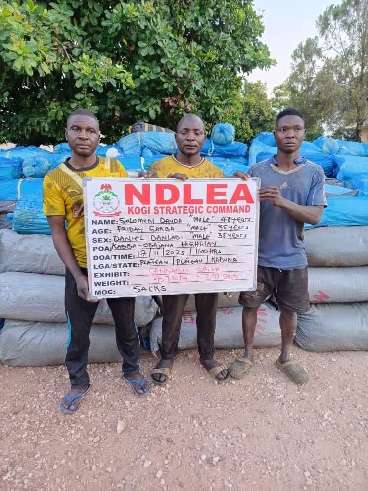 In Kogi state, NDLEA operatives on Monday 17th November intercepted a trailer conveying 4,700 kilograms of skunk, a strain of cannabis at Kabba. Three suspects: Solomon Dauda, Friday Garba and Daniel Danladi accompanying the consignment were arrested while a follow up operation in Jos, Plateau state on Friday 21st November led to the arrest of the kingpin who owns the trailer and the illicit drug consignment, Marcus Danladi Dan Mangu.