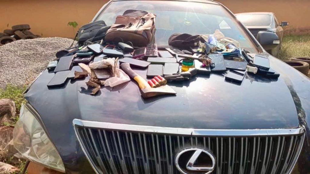 Twenty-seven (27) suspects were successfully arrested, while the following items were recovered and registered as exhibits: One locally made shotgun, One live cartridge, One battle axe, One knife, One Toyota Camry with registration number AUC 377 LU, One Toyota Camry with registration number RBC 867 JJ, One Lexus RX Jeep without registration number, 51 cell phones of different make, 15 Pairs of different colors of Timberland boots, Several Sling bags all containing substance suspected to be Indian hemp
