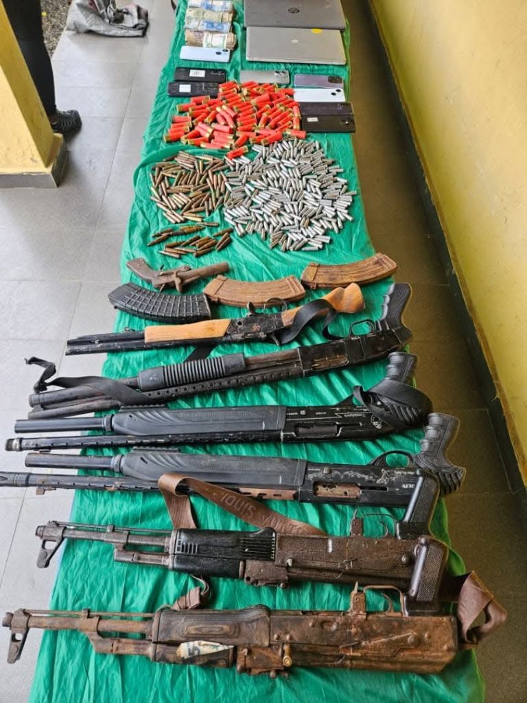 According to the police, five AK 47 rifles, two pump action guns, as well as hundreds of live cartridges and AK 47 magazines, were recovered in the criminal hideout.